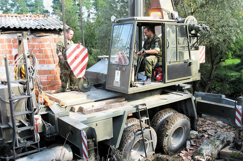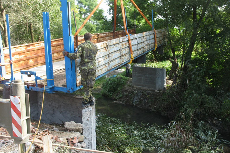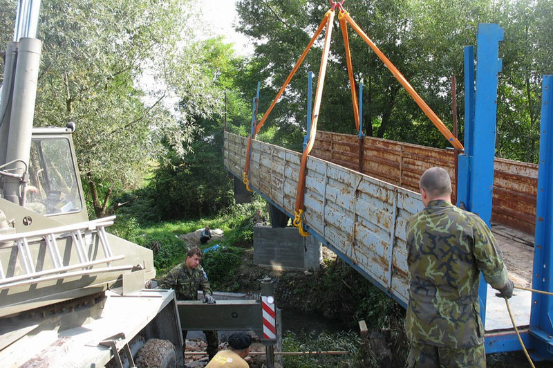 Betonové pilíře již byly na místě a nyní bylo třeba pomocí jeřábu usadit mostní konstrukci. Tohoto úkolu se ujali členové vyprošťovacího týmu roty zabezpečení podpraporčík Jan Havlíček, rotmistr Petr Česánek, rotmistr Robert Vytasil a rotný David Šácha.