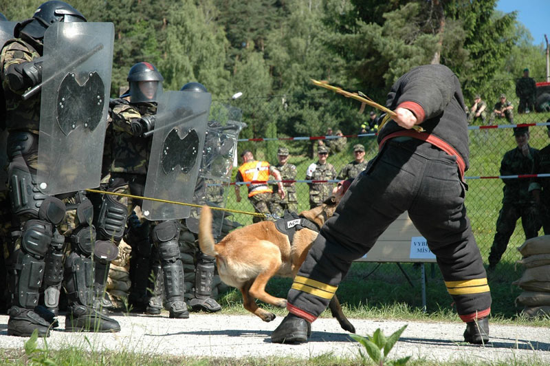 Jedním z dalších důležitých úkolů je zajistit ochranu zasahujících osob při zákrocích proti násilnostem a demonstracím. Tato dovednost je u hlídkových obranných psů rozvíjena během pravidelných nácviků potlačování rozbouřeného davu.