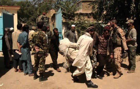 Příslušníci ANA vynášejí krabice s humanitární pomocí