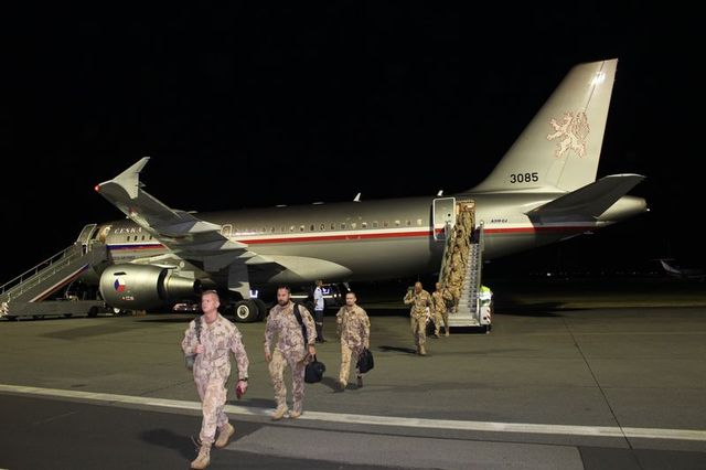 Zleva velitel 44. lehkého motorizovaného praporu podplukovník Igor Jašek, velitel 4. brigády rychlého nasazení plukovník Roman Náhončík a plukovník Petr Vohralík vítá 7. jednotku po návratu z MALI
