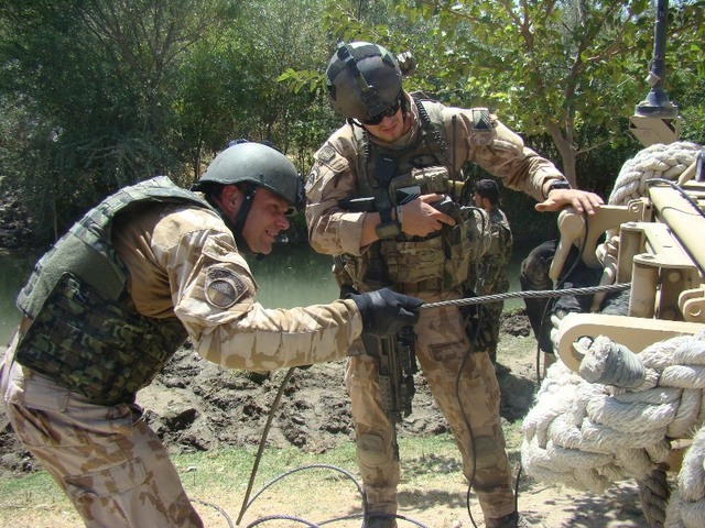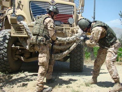 Příslušníci patroly využívají vozidlo MRAP pro uvolnění zanesených zavlažovacích kanálů
