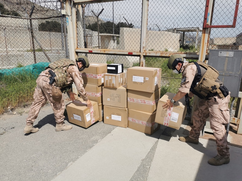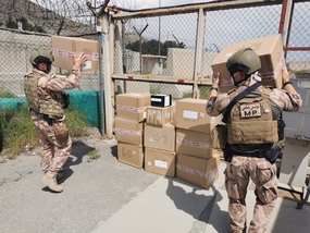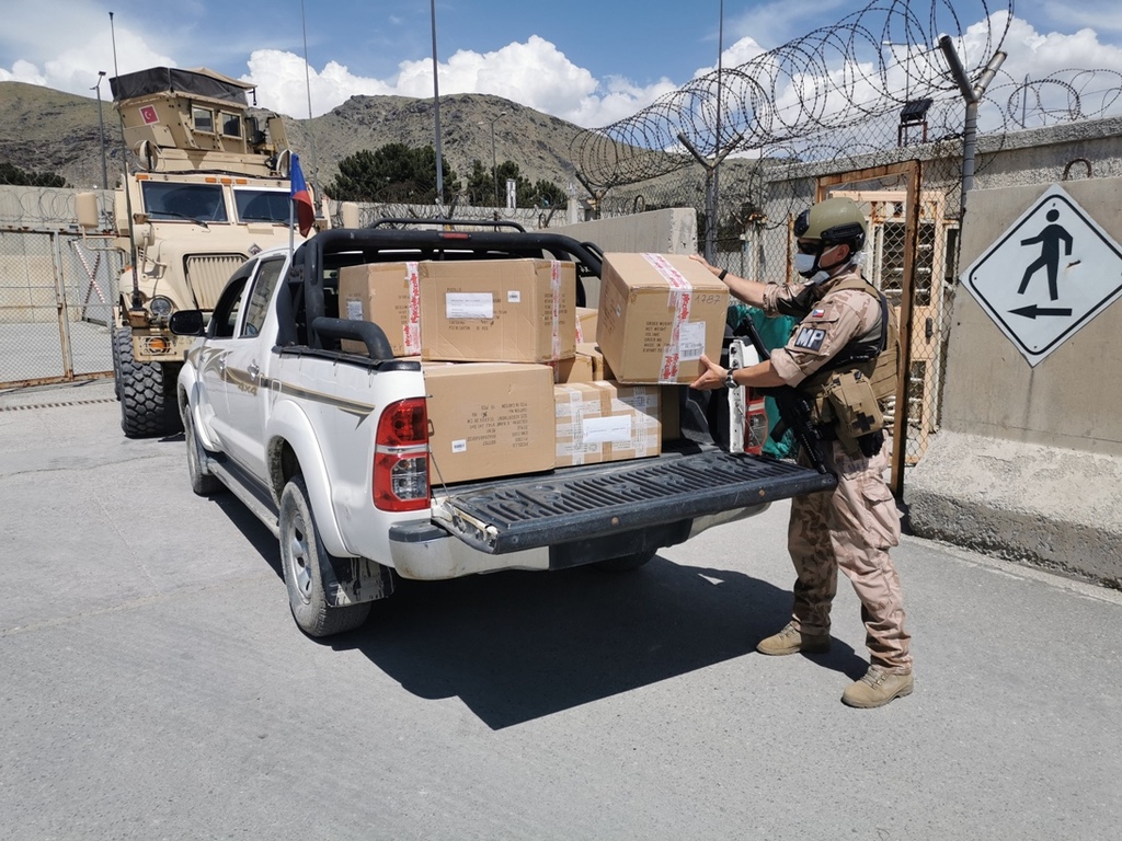 Přivezení humanitární zásilky českými vojáky na místo předání na jednu ze vstupních bran do základny HKIA