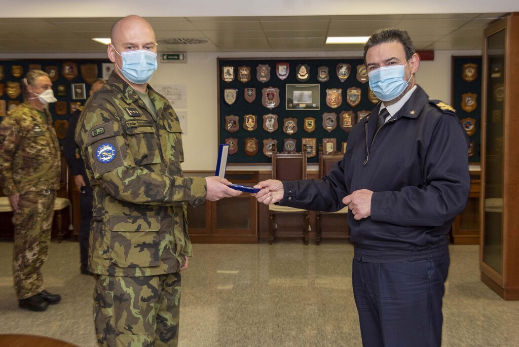 Na snímku uděluje velitel operace Rear Admiral Fabio Agostini medaili veliteli 10. skupiny EUNAVFOR MED plukovníku gšt. Václavu Švecovi.