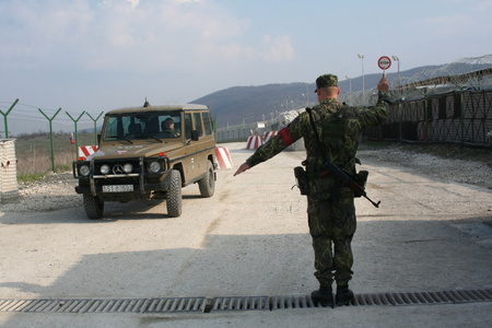 ... kontrolují vojáky a civilisty při příchodu a odchodu ze základny,...