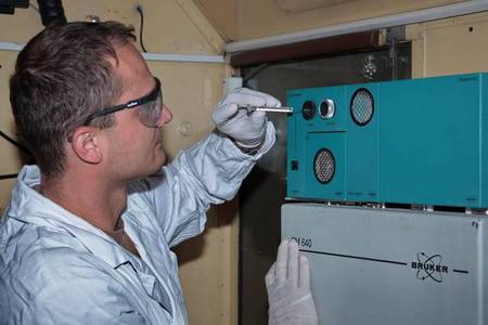 Podpraporčík Michael M. provádí analýzu odebraných vzorků v mobilní chemické laboratoři
