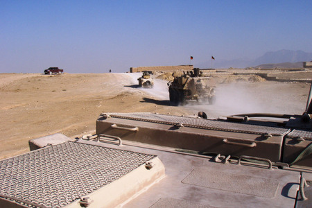 Záběr přesunu z tábora do továrny, okolní krajina je typická pro celý Afghánistán