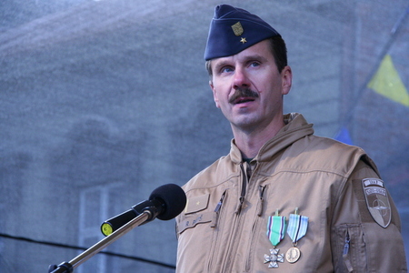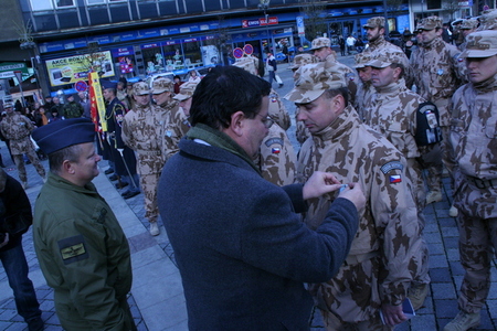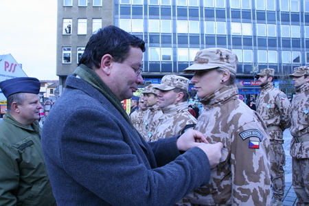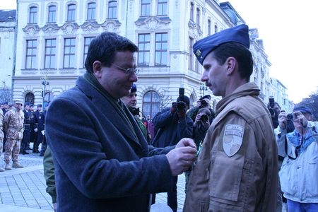 Alexandr Vondra uděluje mjr. Robertu Papšovi, veliteli jednotky, Záslužný kříž ministra obrany ČR