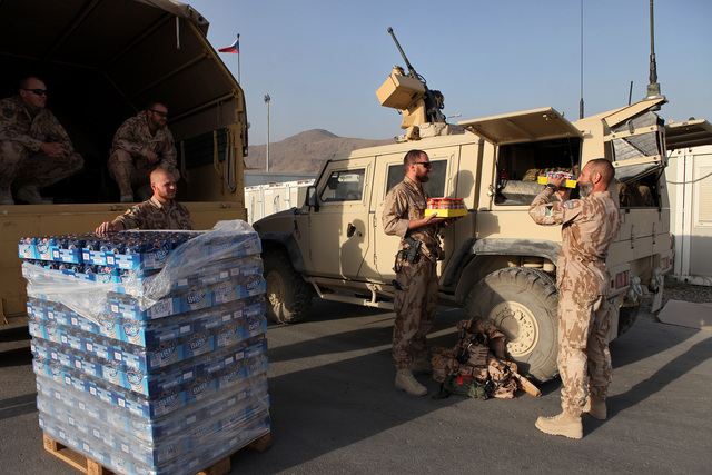 Čeští vojáci v Afghánistánu překládají do aut zásilku utopenců a nealkoholického piva, která právě dorazila