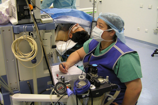 Anesteziologická sestra sleduje stav vitálních funkcí pacienta