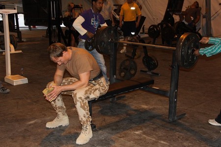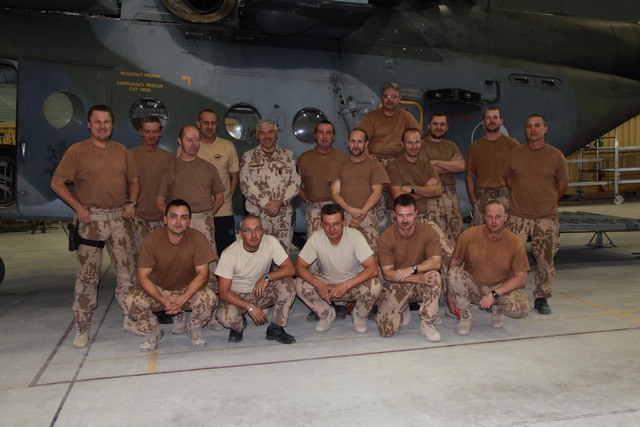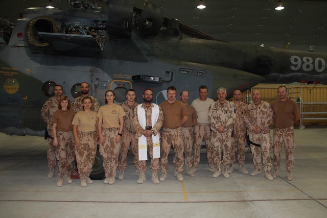 Účastníci bohoslužby s kaplanem 7. vrtulníkové jednotky HELI UNIT kapitánem Petrem Němcem