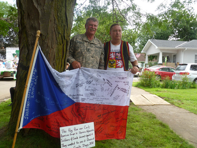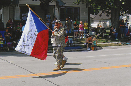 Prezentace vlajky při oslavách spolu s dalším obyvatelem Nebrasky s českými kořeny