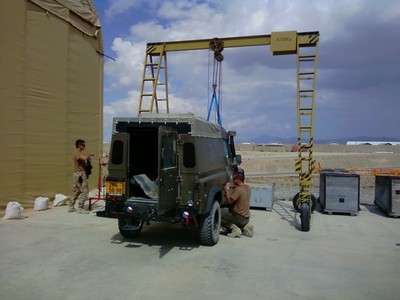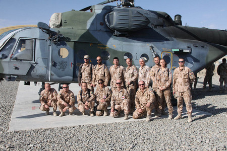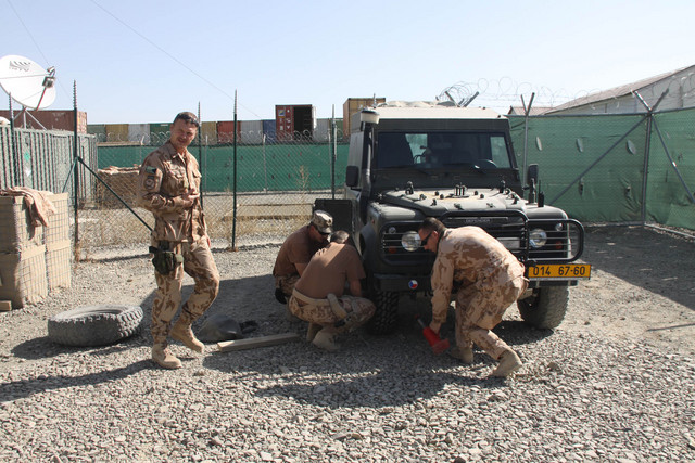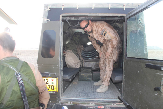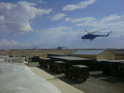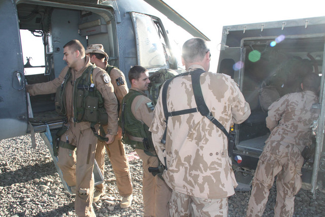 Řidiči čekající na přílet vrtulníků, připraveni přepravit osádky z materiálem