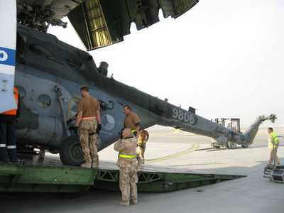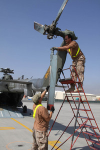 Příslušníci inženýrsko letecké služby při demontáži listů nosného rotoru