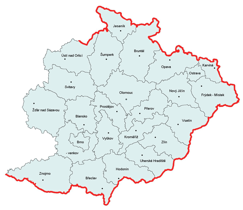 Blansko, Boskovice, Brno, Břeclav, Bučovice, Hodonín, Hustopeče, Ivančice, Kuřim, Kyjov, Mikulov, Moravský Krumlov, Pohořelice, Rosice, Slavkov u Brna, Šlapanice, Tišnov, Veselí nad Moravou, Vyškov, Znojmo, Židlochovice, Bílovec, Bohumín, Bruntál, Český Těšín, Frenštát pod Radhoštěm, Frýdek-Místek, Frýdlant nad Ostravicí, Havířov, Hlučín, Jablunkov, Karviná, Kopřivnice, Kravaře, Krnov, Nový Jičín, Odry, Opava, Orlová, Ostrava, Rýmařov, Třinec, Vítkov, Hranice, Jeseník, Konice, Lipník nad Bečvou, Litovel, Mohelnice, Olomouc, Prostějov, Přerov, Šternberk, Šumperk, Uničov, Zábřeh, Česká Třebová, Králíky, Lanškroun, Litomyšl, Moravská Třebová, Polička, Svitavy, Ústí nad Orlicí, Vysoké Mýto, Žamberk, Bystřice nad Pernštejnem, Nové Město na Moravě, Velké Meziříčí, Žďár nad Sázavou, Bystřice pod Hostýnem, Holešov, Kroměříž, Luhačovice, Otrokovice, Rožnov pod Radhoštěm, Uherské Hradiště, Uherský Brod, Valašské Klobouky, Valašské Meziříčí, Vizovice, Vsetín a Zlín.