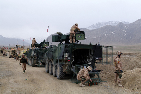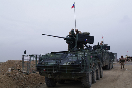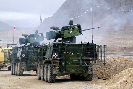 Střelci při přípravě lafetovaných zbraní, v popředí MRAP, za ním DINGO a PANDUR