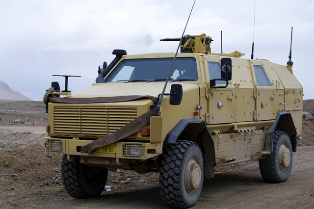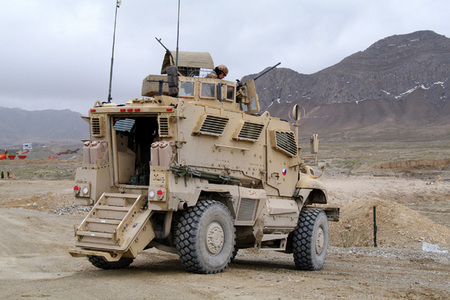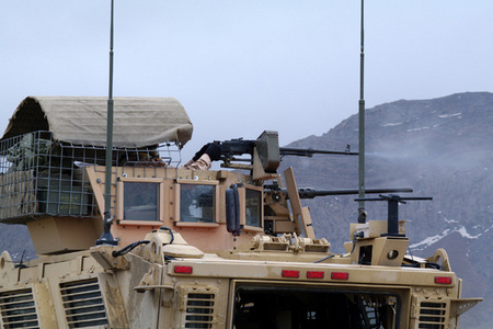 Střelec vozidla MRAP vede palbu z lafetovaných zbraní, v tomto případě k kulometu PKT-B, pod ním je vidět lafetovaný fifti cal