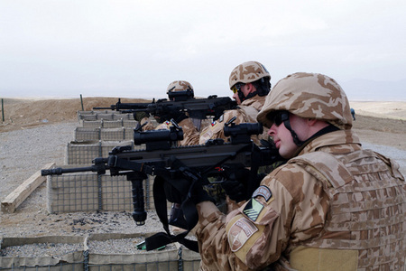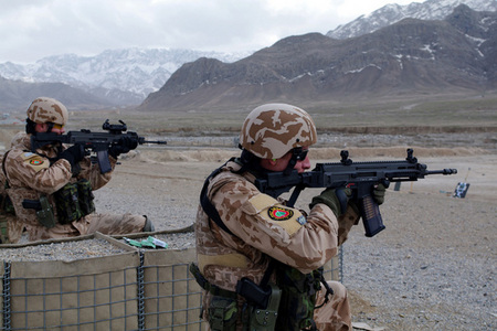 Střelci z útočné pušky CZ 805 BREN A1 (zezadu: CZ 805 BREN A1 s mechanickými mířidly, s kolimátorem ZD DOT 1,5, s kolimátorem ZD DOT 1,5 a denním zaměřovacím přístrojem DV-MAG 3)