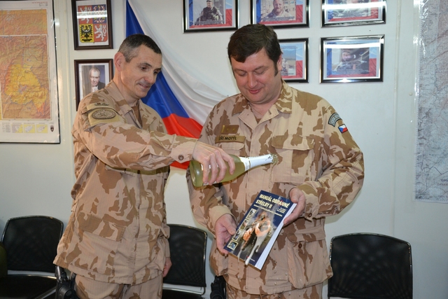 Velitel 6. úkolového uskupení plukovník Trakal s podlukovníkem Motýlem při křtu knihy Manuál obranné střelby II