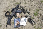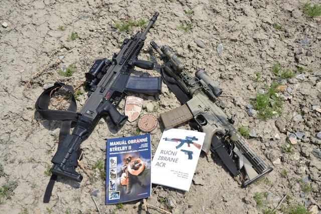 Zátiší s útočnou puškou CZ 805 Bren, karabinou M4 a publikacemi o kterých se píše v článku