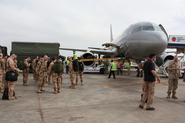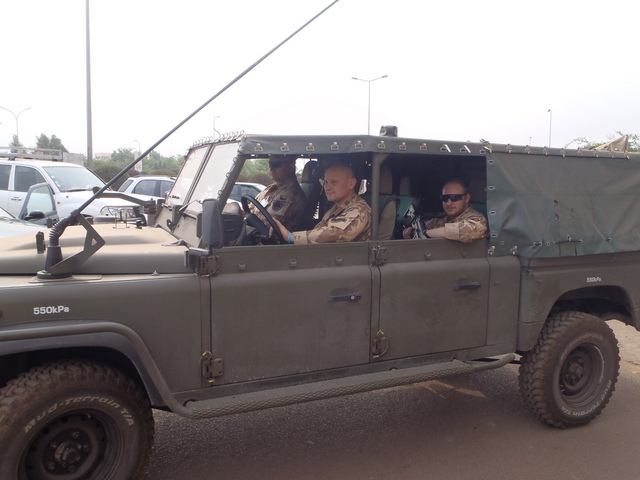 Čeští vojáci opouštějí základnu při doprovodu představitelů velitelství operace EUTM