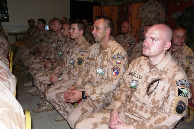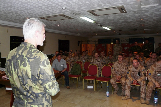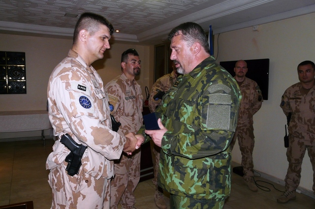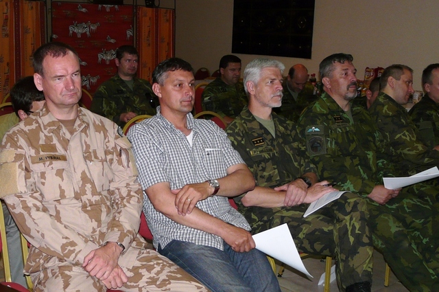 Generálové Petr Pavel a Aleš Opata poslouchají společně se senátorem Josefem Regecem a přidělencem obrany plk. Vybíralem doklad velitele jednotky.
