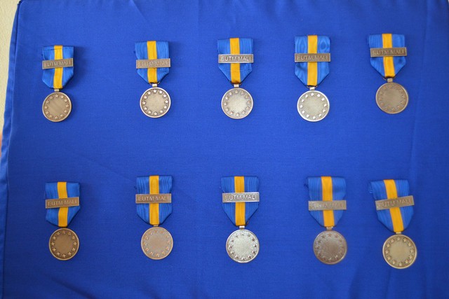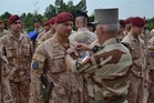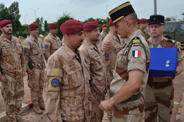 Slavnostní nástup k udělení medailí za účasti brigádního generála Bruna GUIBERTA - velitele mise EUTM 310 - Vojáci sloužící na velitelství mise EUTM v Bamaku na slavnostním nástupu k udělení medailí